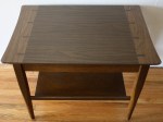 This is a Mid Century Modern side end table in excellent condition. It has a solid wood shelf, tapered legs, and an mcm formica top. The retro design on top is reminiscent of a bowling alley lane with the skinny arrow like slivers. The sides of the table taper in slightly, adding to the unique design.