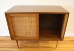 These are 2 mid century modern cabinets made of solid wood. They have two sliding doors that open easily. The first cabinet has a shelf and tapered legs. The second cabinet has woven rattan doors and tapered legs.