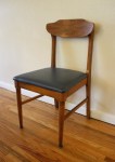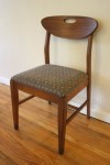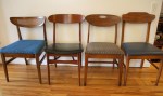 These are 4 mid century modern chairs with upholstered seats. Each chair has a solid wood base, tapered legs, and a rounded back. These beautifully designed chairs are great to match with your mcm desk or dining table, or use as an accent chair.