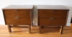 These are 2 pairs of mid century modern side tables. The first pair has 2 dovetailed drawers with brass drawer pulls. The second pair has 1 drawer and parquet wood tops.