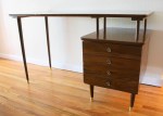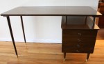 This is a mid century modern floating desk with a suspended compartment of drawers on the right, and tapered legs.