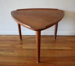 This is a mid century modern guitar pick triangle side end table with surfboard edges. It is teak and marked made in Denmark. Dimensions: 26″W x 26″D x 17.5″H.