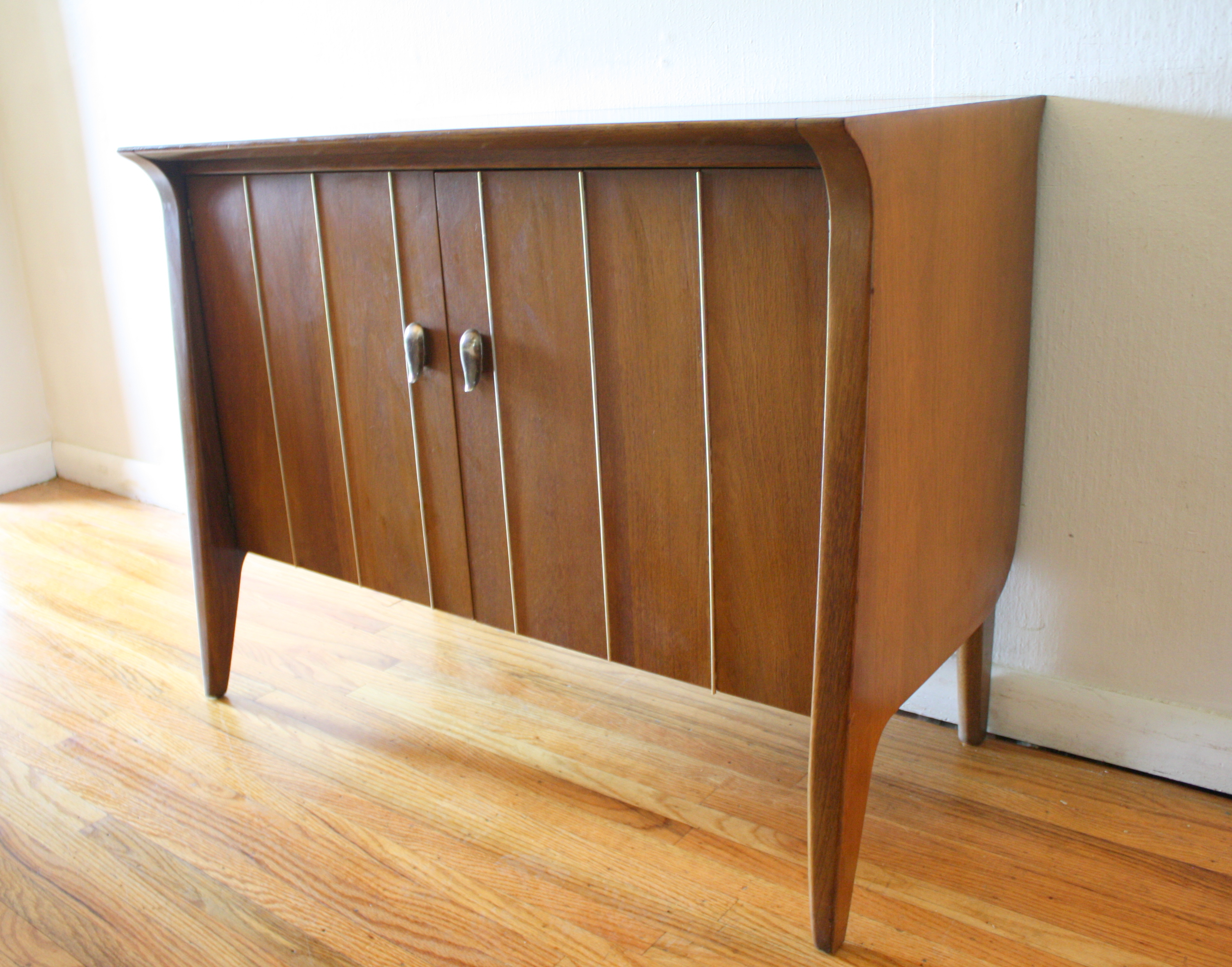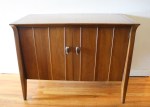 This is a mid century modern cabinet by John Van Koert for Drexel’s Profile collection. It has the signature angled design, metal detailing, and sculpted nickel knobs. There are 2 doors that open to the inside cabinet with shelf. Dimensions: 36″W x 18″D x 28″H.