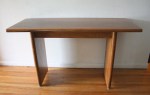 This is a mid century modern console table with a simple clean design. The top has a beautiful wood grain. Dimensions: 50″W x 20″D x 29.5″H.