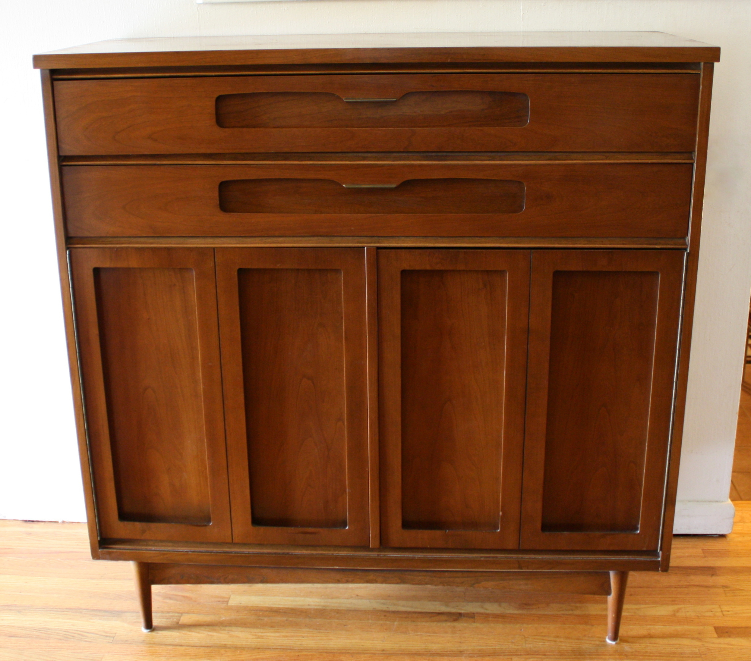 This is a mid century modern high and low dresser by Bassett. Both pieces have brass accented handles, sculpted doors and base. The low dresser has 8 dovetailed drawers: 72″ W x 19″ D x 30.5″ H . The tall dresser armoire has 5 dovetailed drawers and 3 shelves: 46″ W x 19″ D x 47.5″ H.