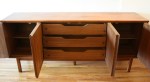 This is a mid century modern credenza made for J.B. Van Sciver. It has 4 sculpted doors, 2 side cabinets with shelves, and a middle cabinet that has 3 dovetailed drawers. Dimensions: 72″W x 18.5″D x 31″H.