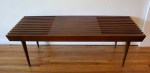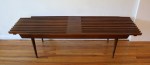 This is a mid century modern slatted coffee table bench with extending sides and tapered legs. Dimensions: 48″W (59″W both sides extended) x 18″ D x 16″ H.