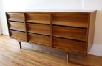 This a mid century modern credenza low dresser credenza by Johnson Carper. It has 9 dovetailed drawers with their signature concave drawer design and tapered legs: 62.5″W x 18″D x 30″H.