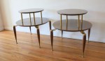 This is a pair of round 2 tiered mid century modern side end tables. They have beautiful brass accents, and sculpted tapered legs. Dimensions: top tier diameter: 17″, bottom tier diameter: 23″, overall height: 23.5″H.