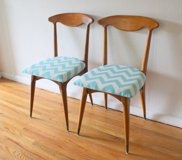 mcm pair of chairs with turquoise chevron 1