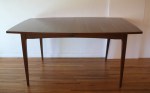 These are 2 mid century modern dining tables. The first dining table has a surfboard design, tapered legs, and 1 extension leaf that adds 12″W. Dimensions: 62″W x 40″D x 30″H. The second dining table has beautiful tapered legs and 2 extension leaves. Dimensions: 60″W x 40″D x 30.5″H. Each leaf adds 15″W.