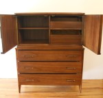 This is a mid century modern tall dresser armoire from Kent Coffey’s Perspecta Collection. It has their signature arched design, 3 bottom dovetailed drawers, 2 shelf cubbies, and 2 more dovetailed drawers in the top cabinet. Dimensions: 41″W x 19″D x 52″H.