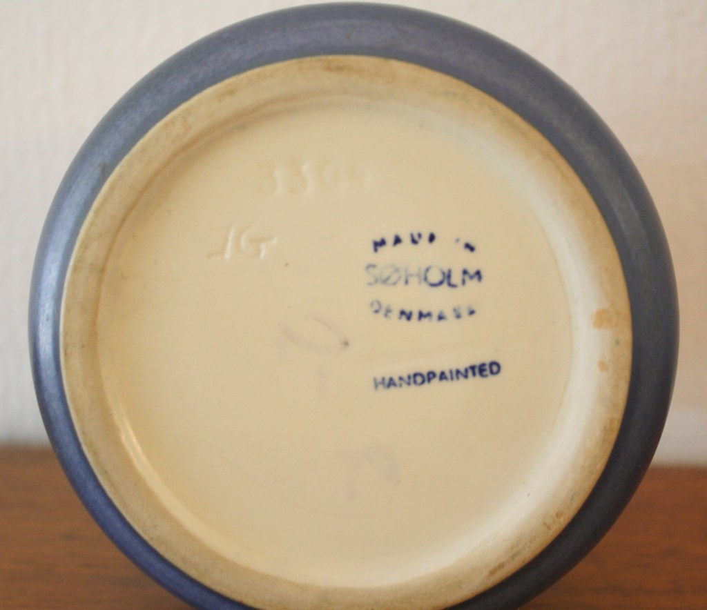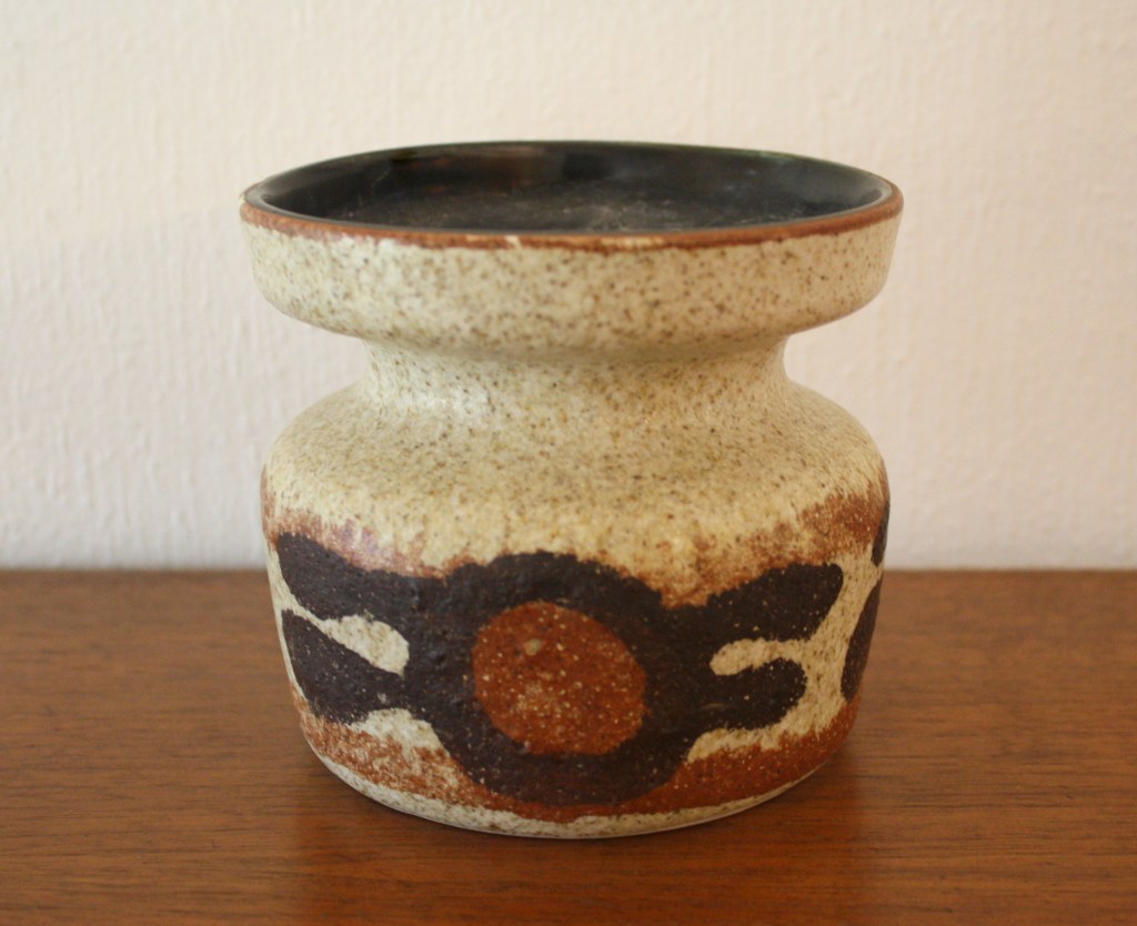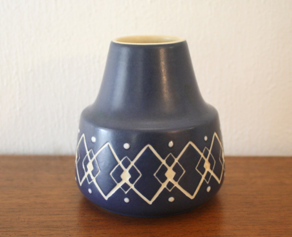 These are 2 mid century modern studio pottery vases from Denmark and Israel. The first vase is from Denmark, with a diamond design in a dark ocean blue. Dimensions: 4.5″ diameter x 4.5″H. The second vase is from Israel by Lapid, with an abstract modern design, in earth tones. Dimensions: 4.5″ diameter, 4″H.