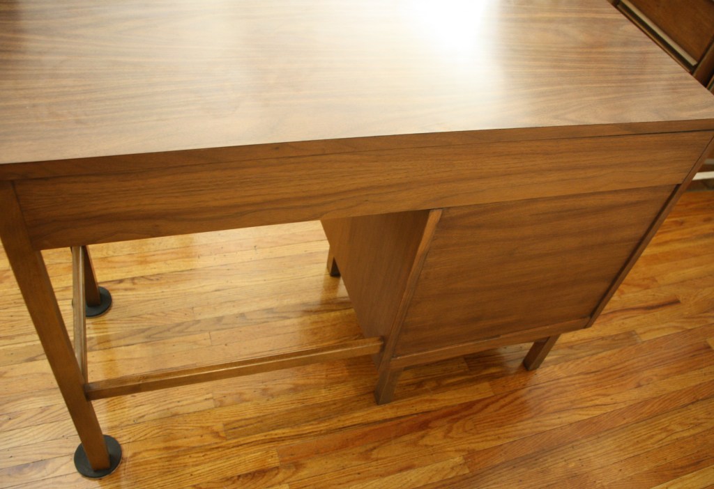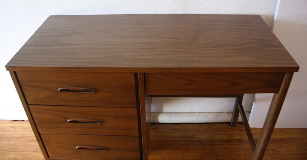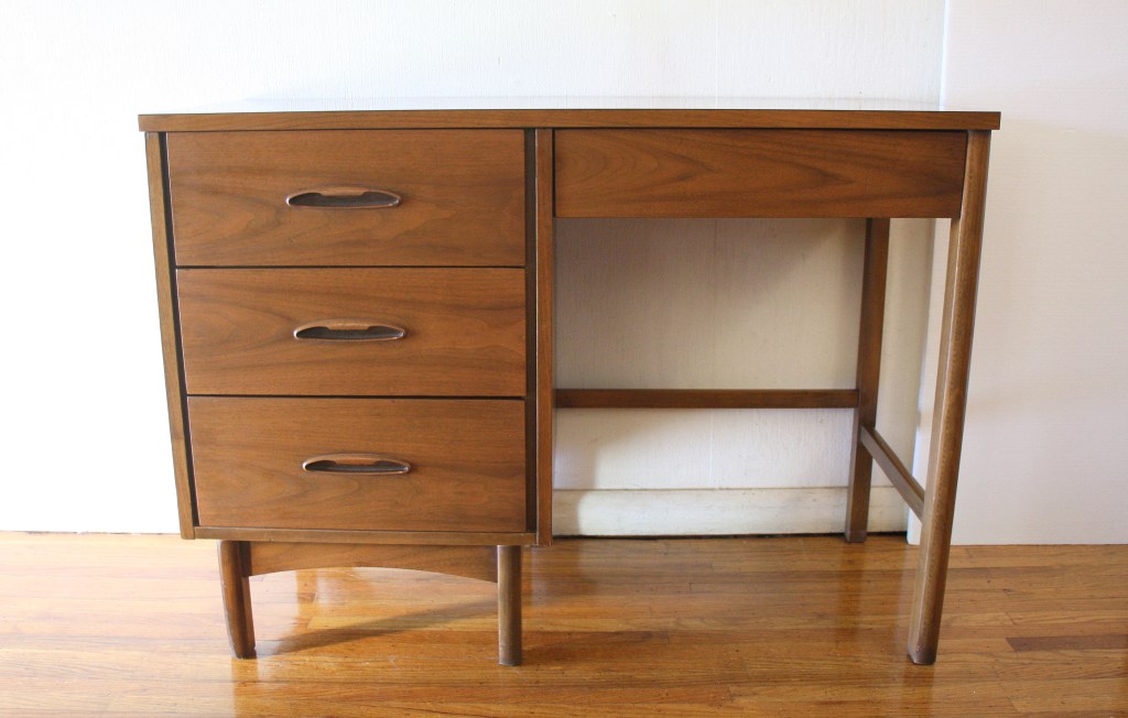This is a mid century modern desk with 4 dovetailed drawers with a beautiful wood grain, streamlined design, and sculpted curved pulls. It has a finished back for versatile placement. Dimensions: 42″W x 18″D x 30.5″H.