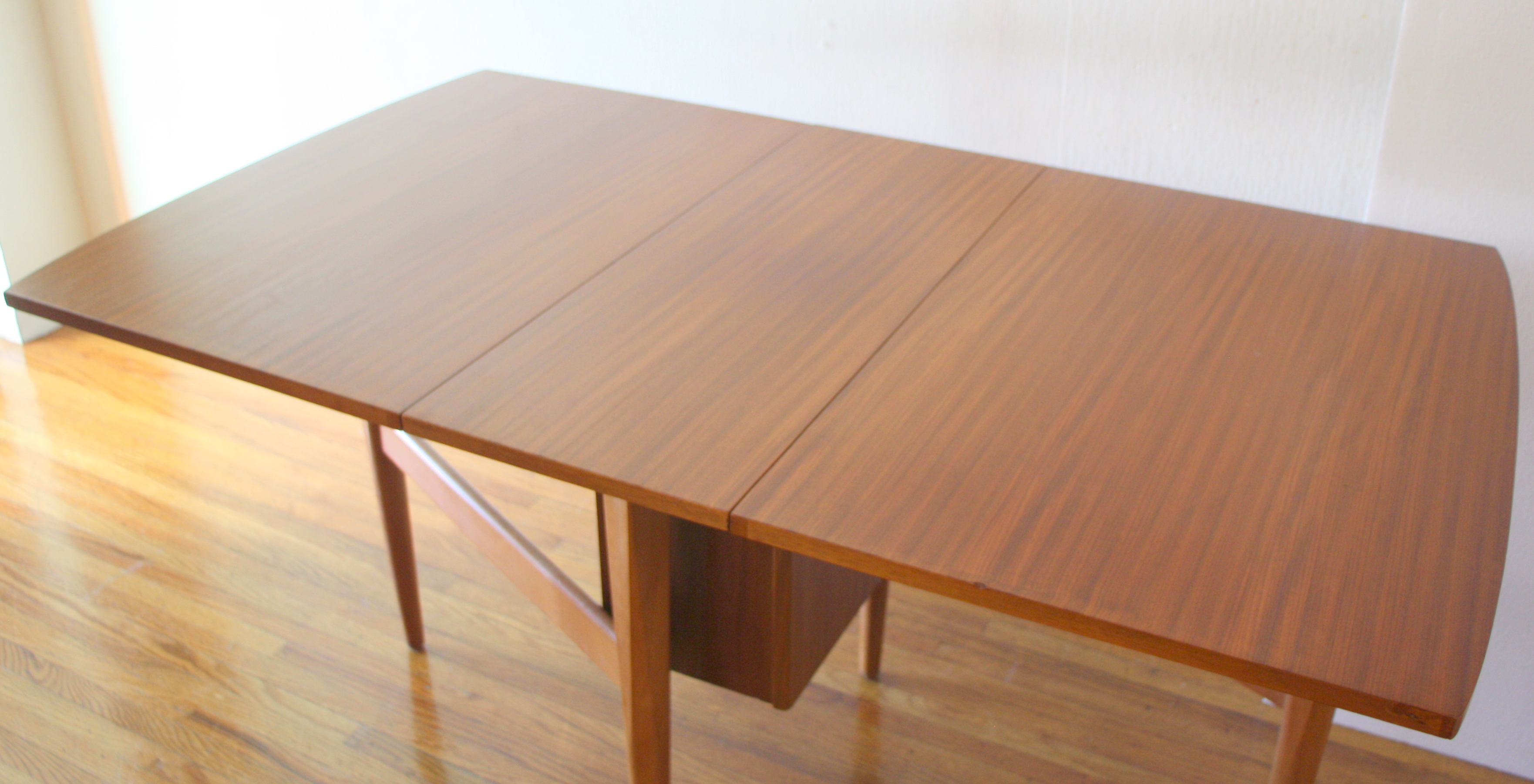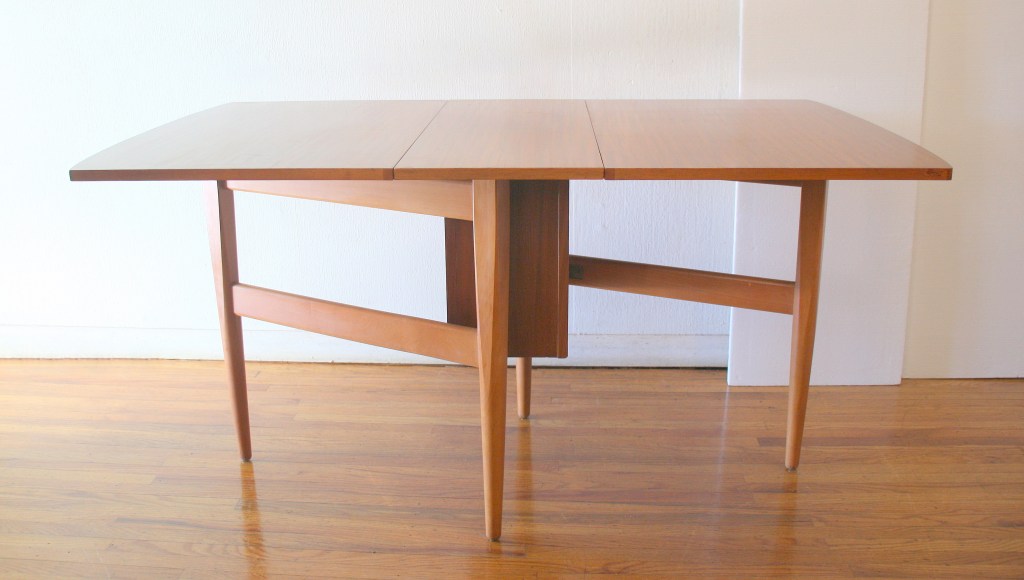 This is a mid century modern gateleg folding table with a beautiful wood grain, surfboard edges, and sculpted tapered legs. It has 2 extension leaves that unfold easily. It also stores compactly down to 12.5″W until needed. Dimensions: 54″W (both leaves extended) x 31.5″D x 28″H.