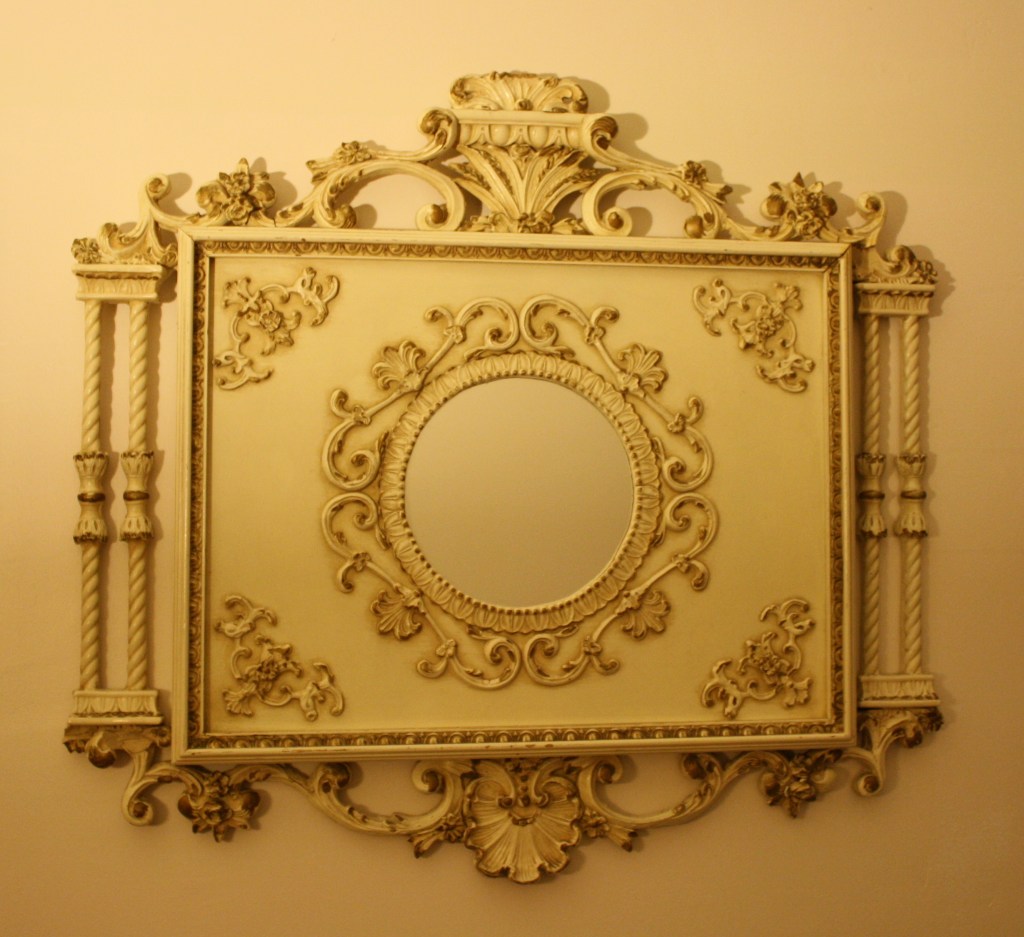 This is a French Provincial mirror with a beautiful ornate scrolling wood frame. The mirror is perfectly intact.