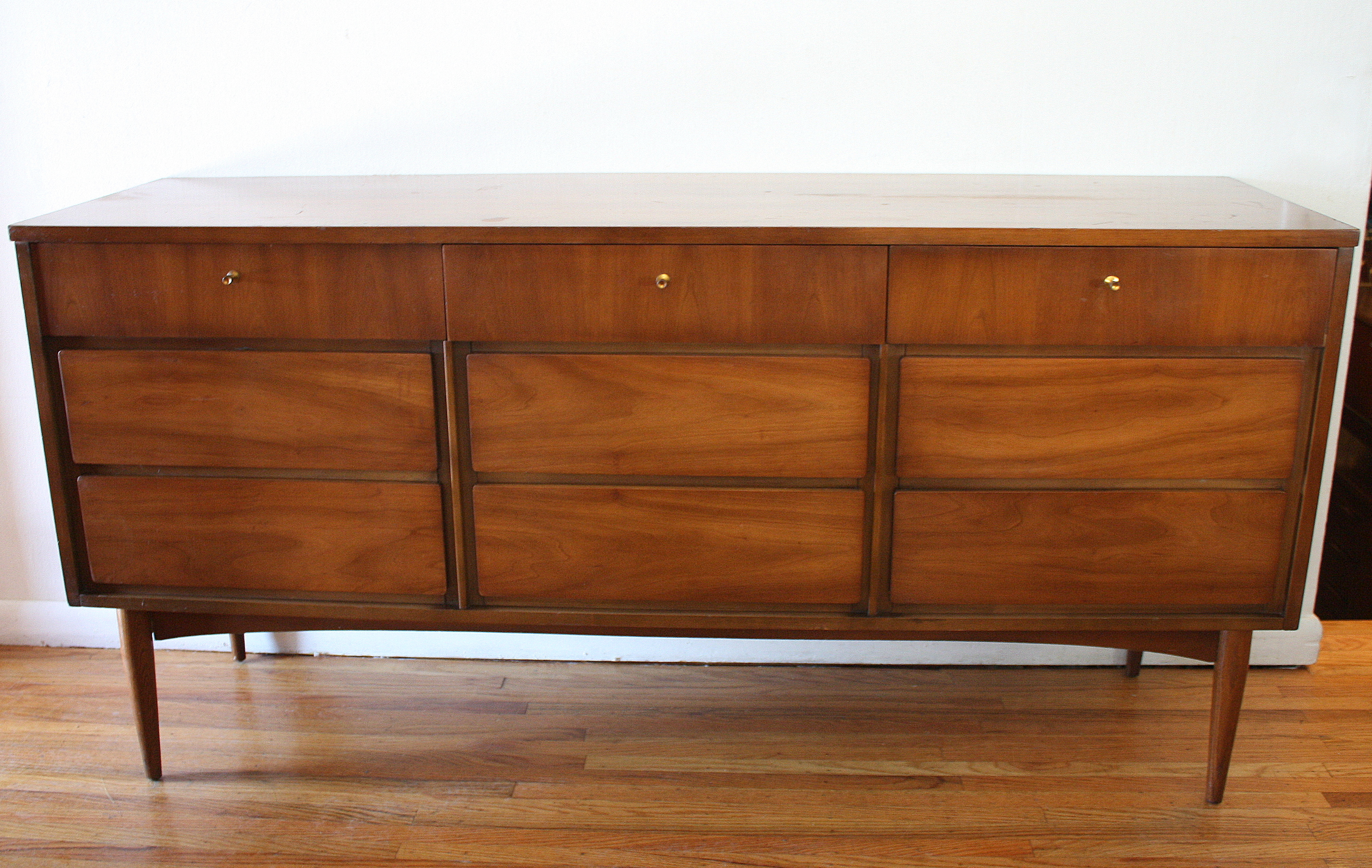 This is a selection of mid century modern low dresser credenzas. The first is from the Broyhill Emphasis collection. It has 9 dovetailed drawers, the signature routed curves, and sculpted wood handles: 72″W x 19″D x 31″H.   The second low dresser credenza is by Dixie.  It has 9 dovetailed drawers with a streamlined drawer design, brass knobs, and an arched base with tapered legs: 64″ x 18.5″D x 32″H.  The third is by Stanley.  It has 9 dovetailed drawers with a sculpted drawer design, brass knobs and brass tipped tapered legs: 64″W x 18″D x 30″H.