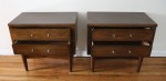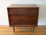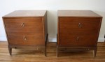 These are matching mid century modern high and low dressers by Dixie. They have a vertical streamlined drawer design and tapered legs. The tall dresser has 5 dovetailed drawers: 36″W x 18.5″D x 44″H . The low dresser credenza has 9 dovetailed drawers: 66.5″W x 18.5″D x 31″H.