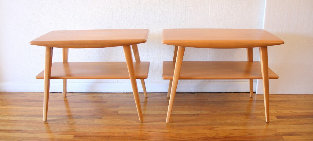 This is a mid century modern china cabinet hutch by Heywood Wakefield in their signature wheat finish. It has 2 sliding glass doors (pictured below), 2 adjustable shelves, 1 dovetailed drawer with their curved pull, and a bottom cabinet with shelving and carved pulls. Dimensions: 34″W x 18″D x 64.5″H.