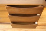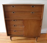This is a mid century modern desk by Hooker. It has a beautiful floating design with metal tipped tapered legs. It has 3 dovetailed drawers with curved brass pulls, a large file drawer on the bottom left, 1 dovetailed utility drawer below the desk, and a shelf cubby. It has finished back so it can be a front facing executive office desk. Dimensions: 49″W x 25″D x 29.5″H.