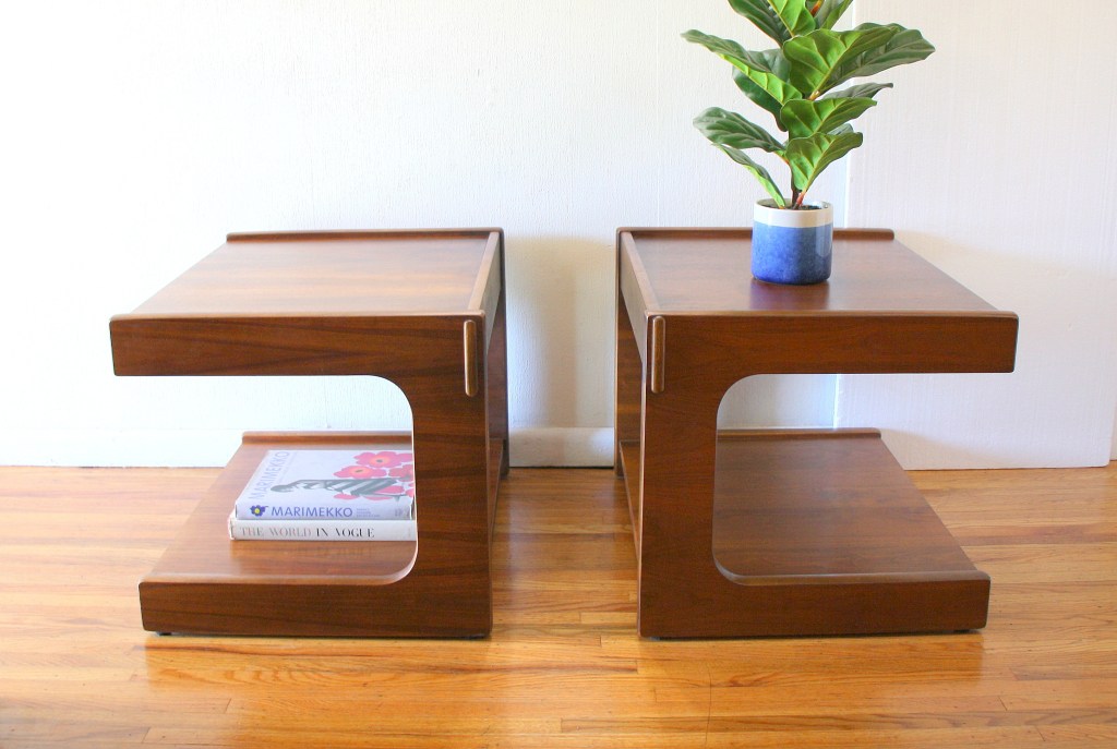 This is a pair of mid century modern side end tables from Lane’s Acclaim series, designed by Andre Bus. They have their signature dovetailed design, bottom shelf with concave accent, and tapered legs. Dimensions: 28″W x 21″D x 20″H.