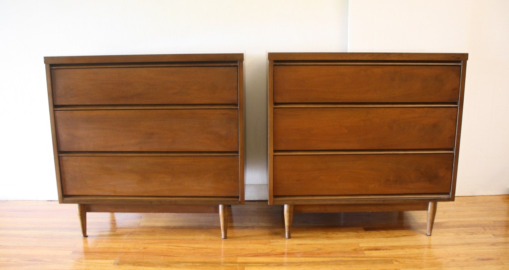 These are 2 mid century modern bachelor chest dressers by Bassett. Each dresser has three dovetailed drawers with a streamlined design, and tapered legs. Dimensions: 32″W x 18″D x 31.5″H.