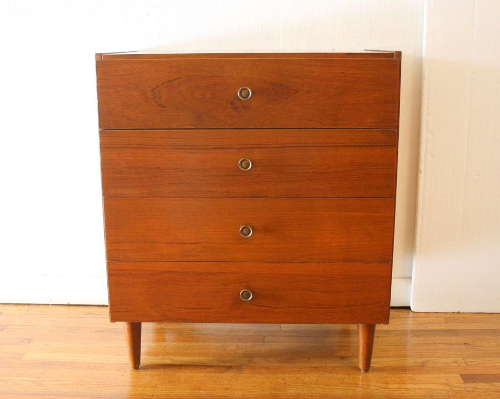 This is a mid century modern bachelor chest dresser with a beautiful wood grain, 4 dovetailed drawers with brass pulls, and tapered legs. Dimensions: 24″W x 16.5″D x 29″H.