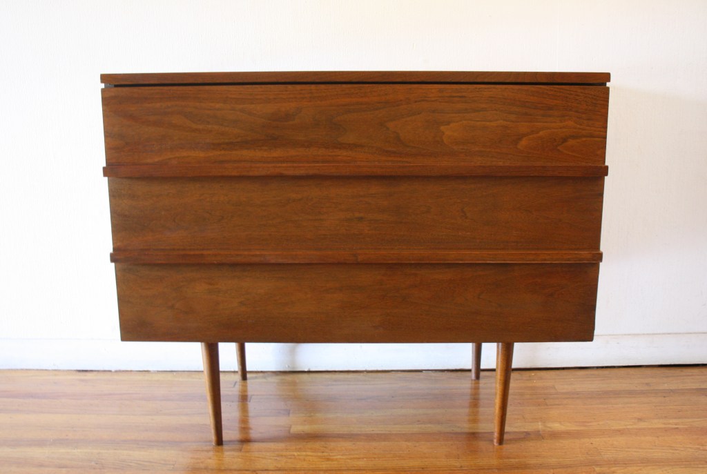 This is a mid century modern bachelor chest dresser by Johnson Carper. It has 3 dovetailed drawers with their signature concave design, and tapered legs. Dimensions: 32″W x 18″D x 30″H.