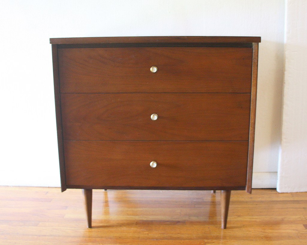 This is a mid century modern bachelor dresser by Harmony House. It has 3 dovetailed drawers with enameled white brass knobs, and tapered legs. Dimensions: 30″W x 18″D x 31″H.