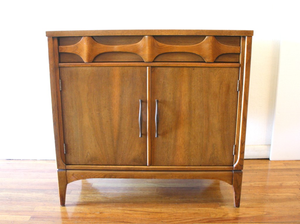 These are 2 mid century modern Campaign pieces by Thomasville. The side end table nightstand has 3 dovetailed drawers with gorgeous brass pulls and accents: 18″W x 12″D x 27″H. The slim cabinet has 5 dovetailed drawers with the same brass pulls and accents: 28″W x 9″D x 34″H.