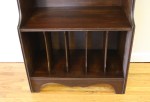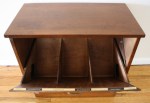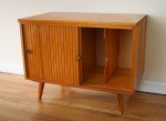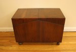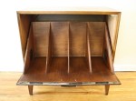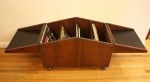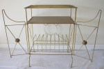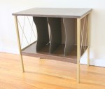These are 2 mid century modern wire record rack stands. Both have a atomic gold ball details. The first record rack has a great arched design and 2 levels of storage: 13.5″W x 12″D x 27″H. The second is a rolling record rack with a shelf on top to store more records or a record player: 20.5″W x 14″D x 27.5″H.