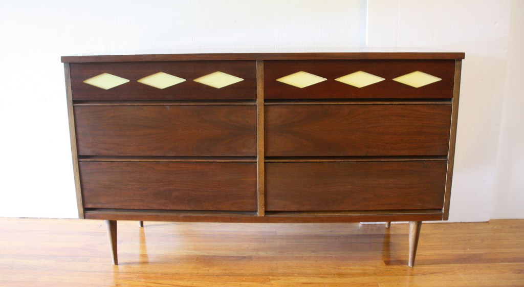 This is a mid century modern tall dresser by Harmony House. It has four dovetailed drawers, with brass bow tie and streamlined drawer pulls, and tapered legs. Dimensions: 40.5″W x 18″D x 43.5″H.