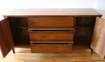 These are 3 mid century modern credenzas. The first credenza is from the Broyhill Sculptra collection, has 3 dovetailed drawers with sculpted handles and a side cabinet with sculpted door: 56″W x 19.5″D x 30″H. The second credenza has 3 dovetailed drawers with a streamlined drawer design, and a rattan door on the left side cabinet: 60″W x 18″D x 30″H. The third credenza has a parquet design and 3 streamlined dovetailed drawers: 56″W x 18″D x 31″H.