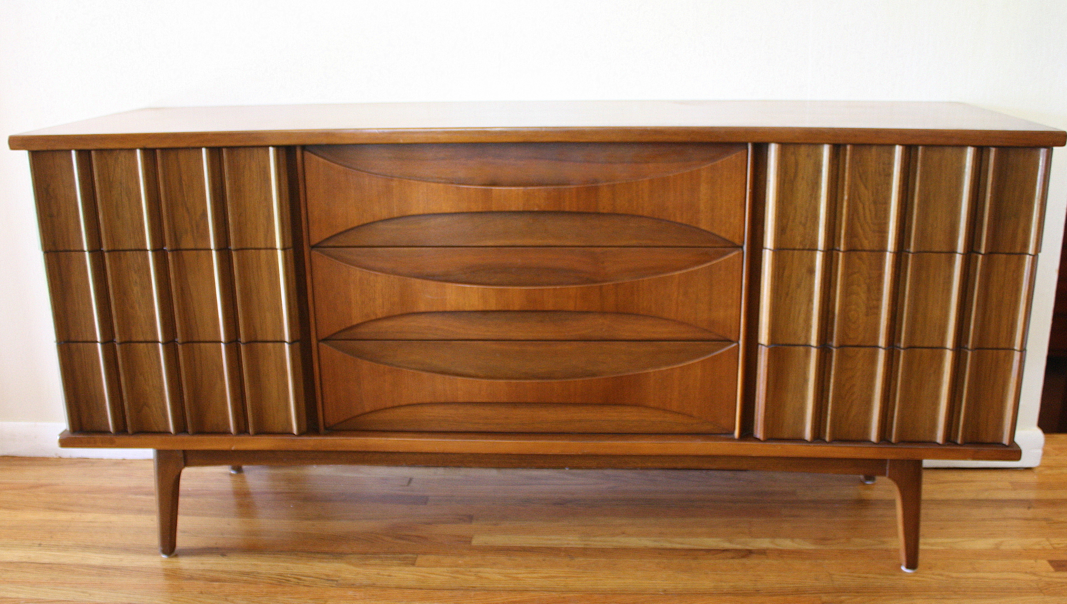 This is a mid century modern low dresser credenza with a matching side end table nightstand. The low dresser credenza has 6 dovetailed drawers with a streamlined design and tapered legs: 54″W x 18″D x 31.5″H. The matching side end table has the same streamlined design on 2 dovetailed drawers: 24″W x 15″D x 23″H.