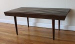 This is a mid century modern coffee slatted coffee table bench with an extending design and tapered legs. Dimensions: 52″W (can extend to any desired width to a maximum of 72″ open) x 17″D x 15″H.