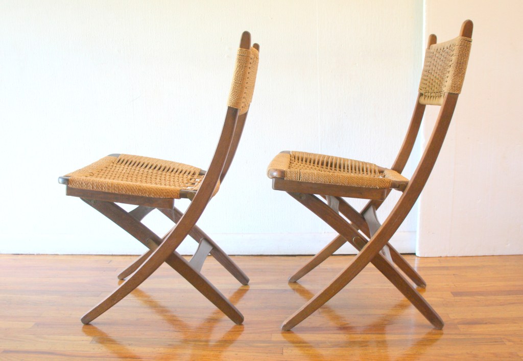 This is a pair of mid century modern Hans Wegner style folding chairs with solid wood frames and woven seats and backs. Dimensions: seat width: 17.5″, seat depth: 16″, seat height: 17″, back height: 31.5″.