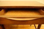 This is a Mid Century Modern Desk that is in great condition. It is from the United Furniture Corporation, from Lexington North Carolina. The desk is made of solid wood and is very sturdy. It has a removable glass top, and the signature tapered legs. There are also three dovetailed drawers that pull out easily and with brass drawer handles.