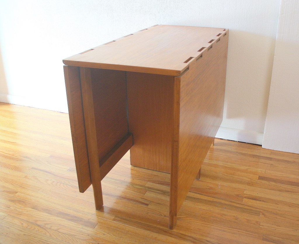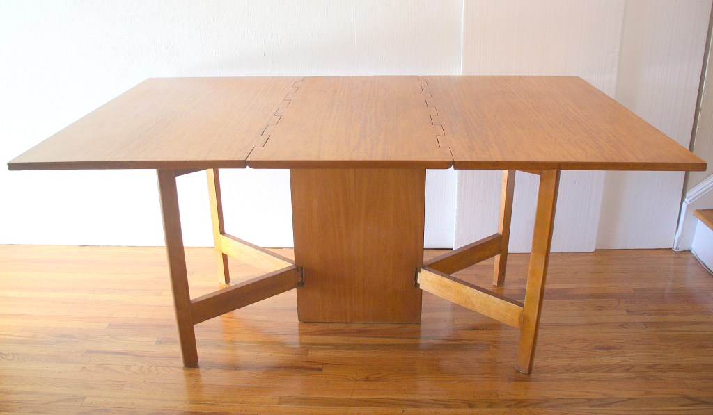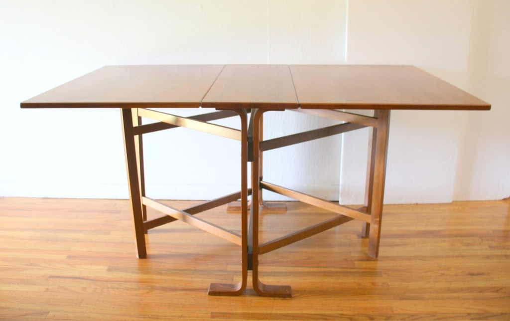 This is a mid century modern gateleg folding table. It has 2 extension leaves that unfold easily, and rolls on wheels for easy transport. It also stores compactly down to 6″W until needed. Dimensions: 55″W (both leaves extended) x 34″D x 30″H.