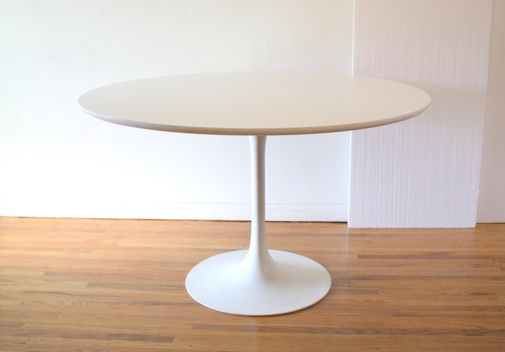 This is a mid century modern Saarinen style round dining table with mod white formica top and pedestal base. Dimensions: 47.5″ diameter x 28.5″H.