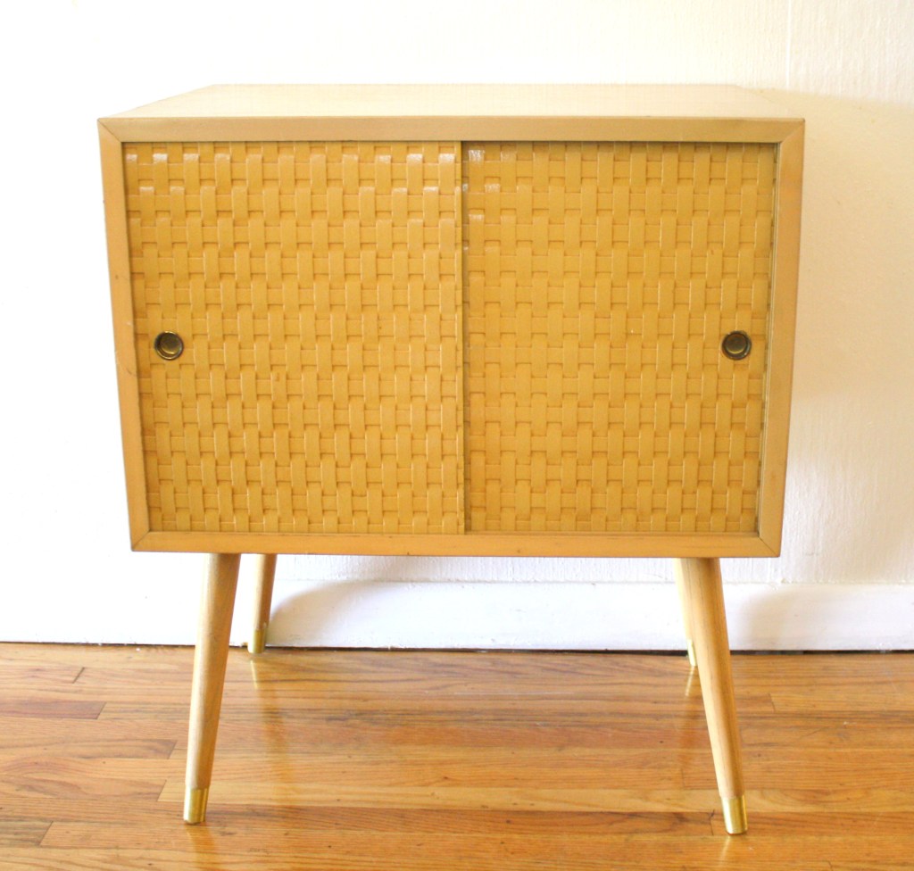 This is a mid modern side table with basket weave sliding doors. It has the signature mcm legs and a cheerful blonde finish.
