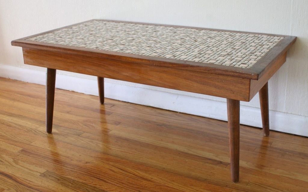 This is a mid century modern coffee table with beautiful retro tile work. It is made out of solid wood and has the signature mcm tapered legs.
