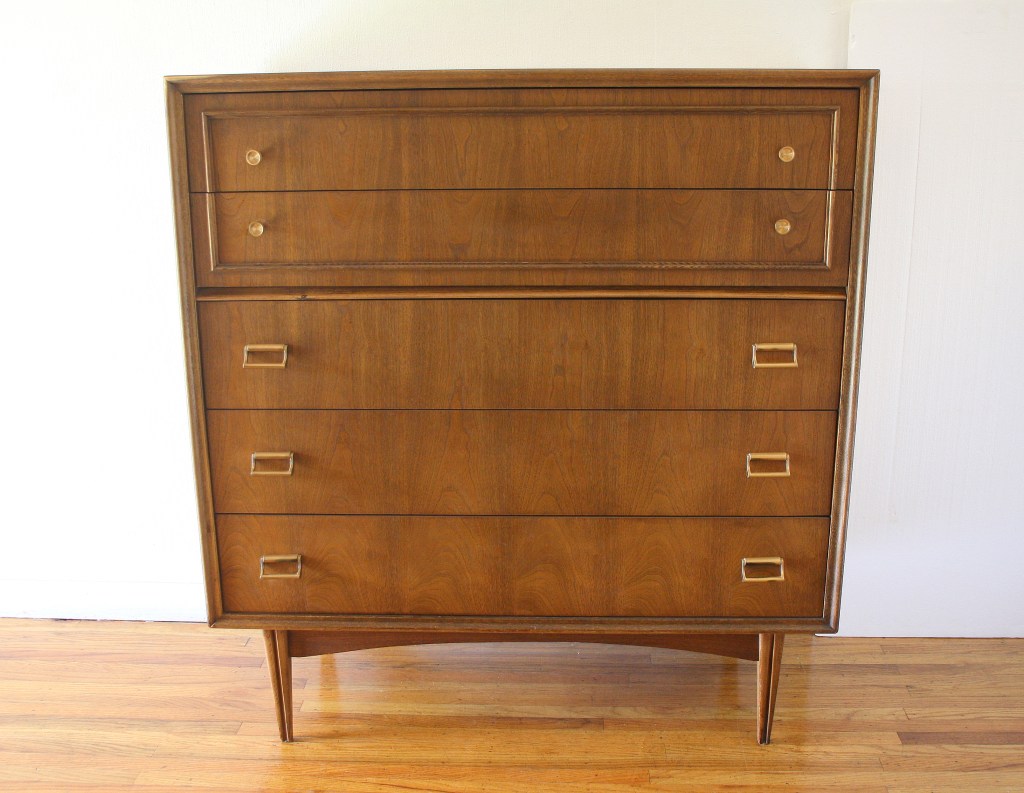 This is a mid century modern tall dresser by Bassett. It has five dovetailed drawers with handsome brass knobs and pulls, an arched base, with sculpted tapered legs. Dimensions: 40″W x 18″D x 43.5″H.
