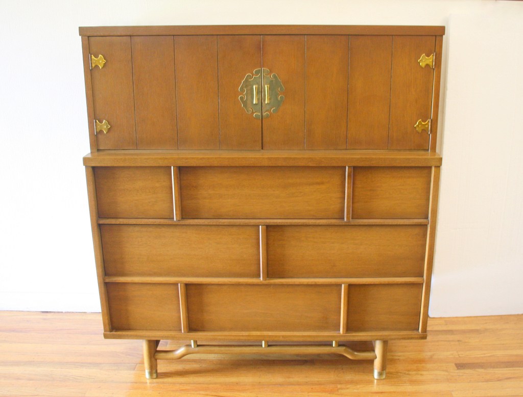 This is a mid century modern tall dresser armoire that has five dovetailed drawers, three with vertical pulls and the top two within an armoire top with doors. It has beautiful brass accents, door pulls, and faux bamboo base. Dimensions: 42″W x 19″D x 46″H.