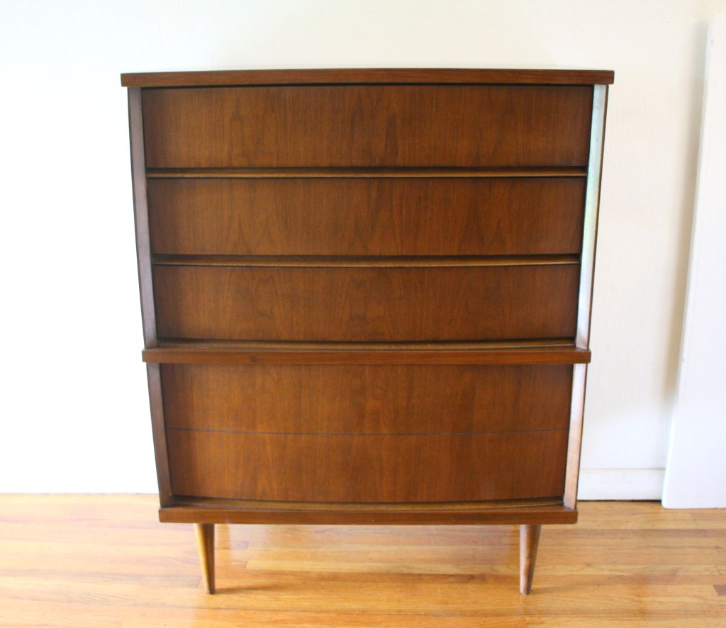 This is a mid century modern tall dresser by Bassett. It has a 4 dovetailed drawers with a beautiful convex curve design, with tapered legs. The bottom drawer is deep for storage. Dimensions: 34″W x 18″D x 43″H.