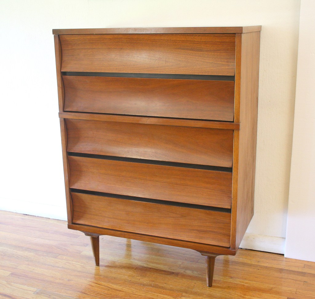 This is a mid century modern tall dresser that has four dovetailed drawers with a beautiful rippled waterfall wave design, and tapered legs. Dimensions: 34″W x 17.5″D x 42″H.