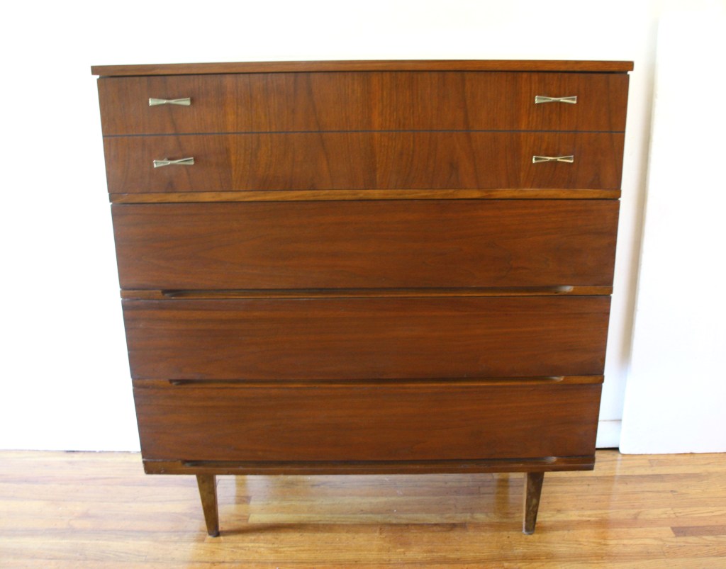 This is a mid century modern tall dresser by Harmony House. It has four dovetailed drawers, with brass bow tie and streamlined drawer pulls, and tapered legs. Dimensions: 40.5″W x 18″D x 43.5″H.
