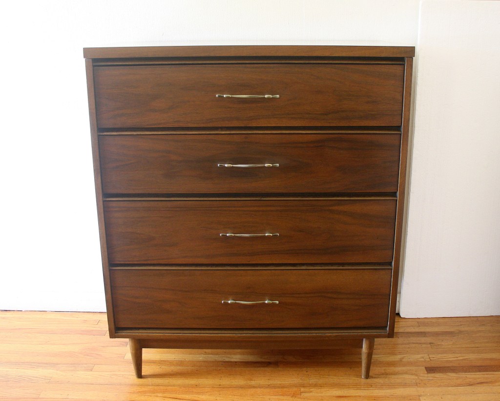 This is a mid century modern tall dresser with a beautiful wood grain, 4 dovetailed drawers with an angled design, and splayed tapered legs. Made by Baumritter. Dimensions: 32″W x 19″D x 41.5″H.