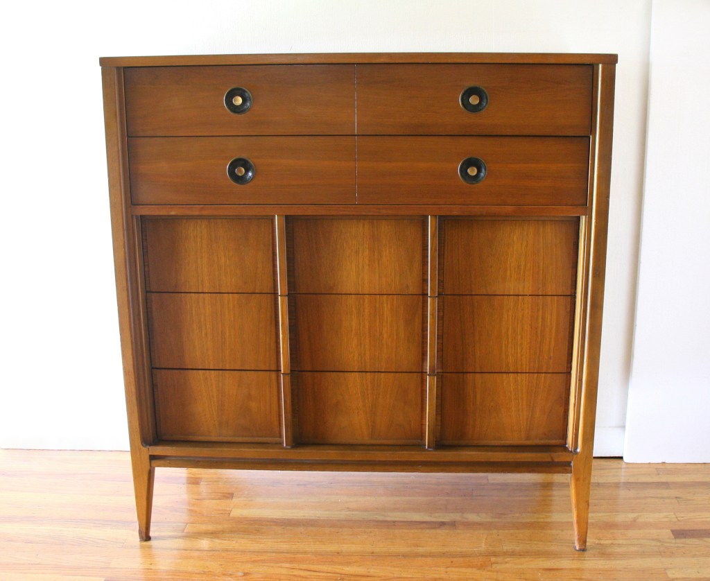This is a mid century modern tall dresser by Bassett. It has four dovetailed drawers with a rippled concave drawer design for the top drawer, and three bottom drawers with complimentary curved brass pulls and tapered legs. Dimensions: 32″W x 18″D x 43″H.