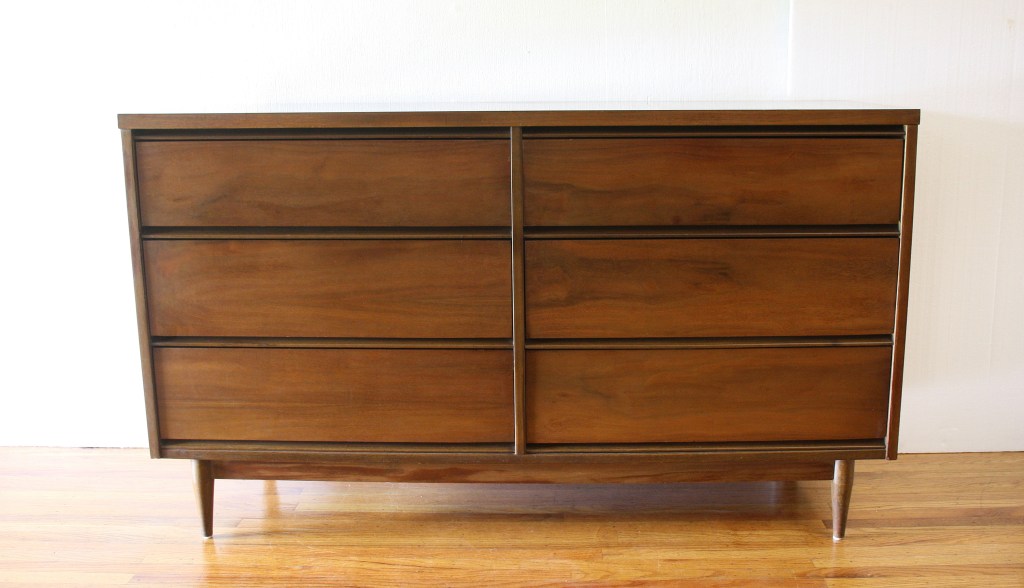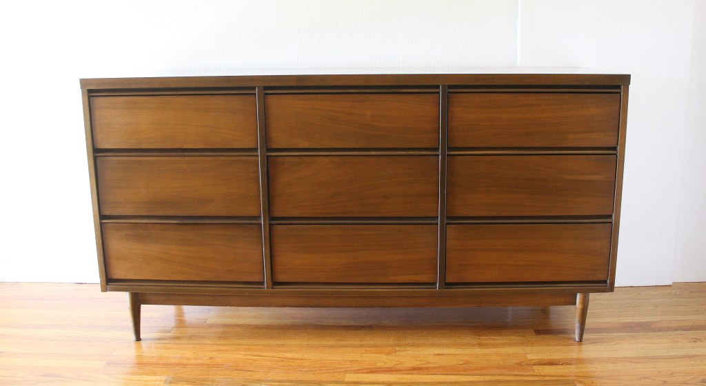 These are a matching set of mid century modern pair of nightstands, high and 2 low dressers with a clean streamlined design and tapered legs, by Broyhill. The pair of nightstands has 1 dovetailed drawer, and bottom shelf: 20″W x 14″D x 24″H. The tall dresser has 4 dovetailed drawers: 36″W x 18″D x 42″H. The first low dresser has 6 dovetailed drawers: 54″W x 18″D x 32″H. The second low dresser has 9 dovetailed drawers: 60″W x 18″D x 32″H.