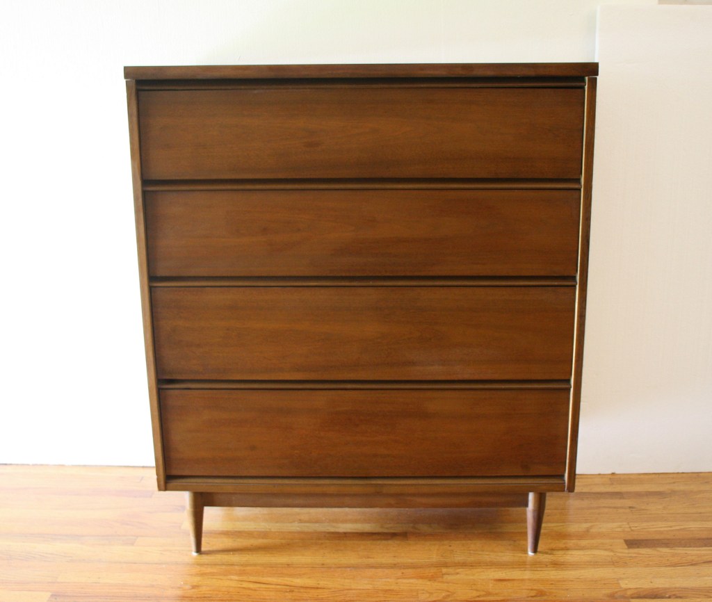 This is a mid century modern tall dresser that has 4 dovetailed drawers with a streamlined design, and tapered legs. Dimensions: 36″W x 18″D x 42.5″H.